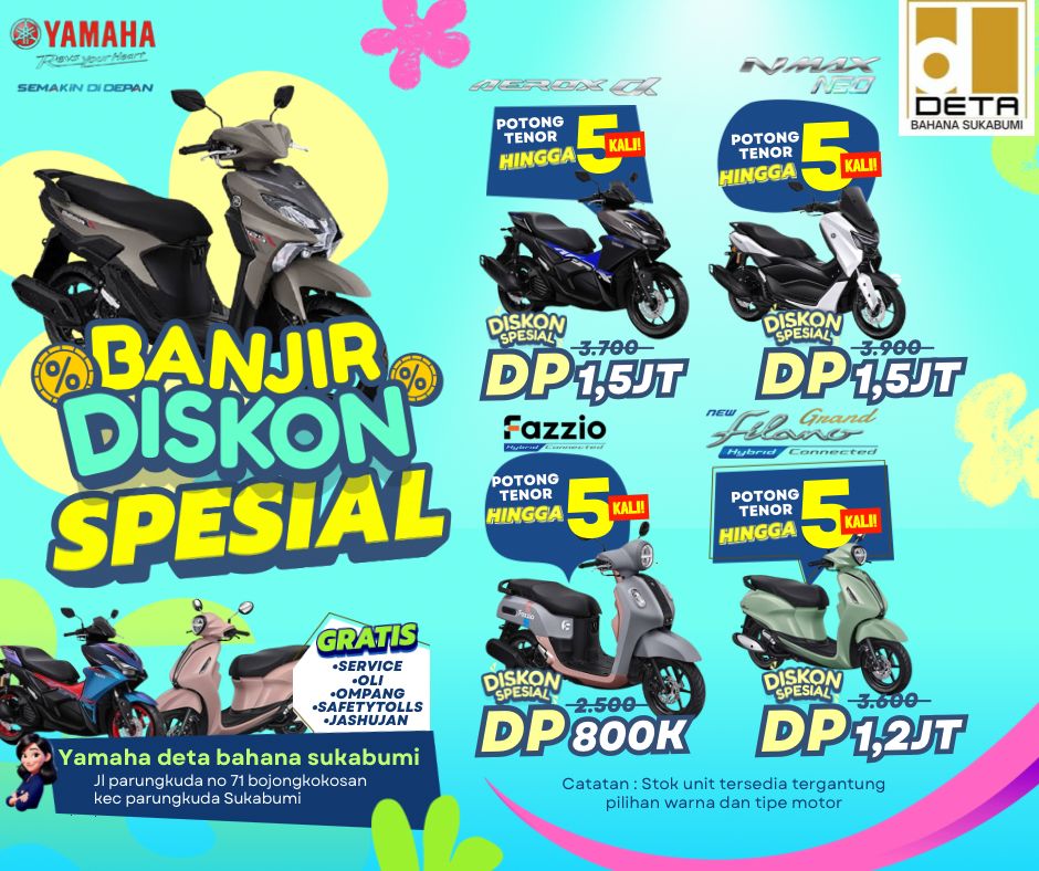 Yamaha Bahana Sukabumi Official (Deta Group) adalah salah satu dealer resmi Yamaha Indonesia terbesar dan terpercaya di wilayah Jawa Barat. Melayani seluruh area dengan komitmen memberikan kemudahan dalam pembelian sepeda motor Yamaha secara online melalui situs resmi kami. Temukan berbagai pilihan produk unggulan dan promo menarik yang tersedia untuk setiap unit.